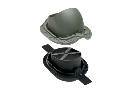MUOTOKATE 2K проходной элемент для металлочерепицы с профилем Monterrey (ширина волны ≈ 183,3 мм, длина профиля min 350 мм, высота профиля ≈ 39 мм). В комплект входит двухкомпонентный 2K-уплотнитель гидрозатвора, гарантирующий полную герметичность прохода через гидрозащитную пленку.