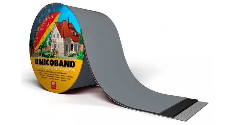 Герметизирующая лента Никобaнд (NICOBAND) получают путем одностороннего нанесения на фольгированною УФ — стойкую пленку самоклеящегося битумно-полимерного вяжущего, состоящего из битума, полимерного модификатора и специальных адгезионных добавок.